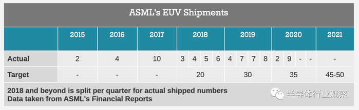 唯一制造EUV机器的公司是ASML,并且该公司公开宣布其每年销售多少台机器。详情如下: