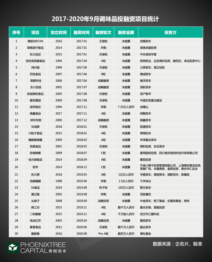 这已然是千亿级的大市场,据中国调味品协会,调味品主要是在饮食、烹饪和食品加工中广泛应用的一种消费品,有调和滋味、气味,去腥、除膻、解腻、增香、增鲜等作用。一般可分为2大类:单一调味品、复合调味品。 调味品在资本市场表现亮眼,二级市场的火热格外明显,主要呈现3大特点:1)目前A股共27家调味品相关的上市公司,其总市值一路走高。据Wind数据,2020年9月高达9191亿元,较2019年底上涨71%。2)头部企业市值领先,海天味业超5000亿,中炬高新、安琪酵母、天味食品等11家公司位列百亿梯队。3)估值溢价率很高,上海证券数据显示,2020年上半年,调味品在食品饮料子版块中,估值溢价率始终保持400%以上,明显高于其他子版块。二级市场的一路高歌猛进,也增强了一级市场的关注度。 在一级市场,笔者调研了100+大消费领域的投资人发现,资本普遍对调味品关注度很高。从鲸准、企名片的融资数据来看,2017-2020年9月,共30个项目完成融资,2020年1-9月有3个。融资轮次主要集中在A轮之前,偏早期。 品类上看,复合调味品备受资本青睐,30个融资项目中,生产复合调味品有25家。获得融资的公司,传统企业和2010年以后成立的新品牌“半分天下”,两者分别占12个、13个。