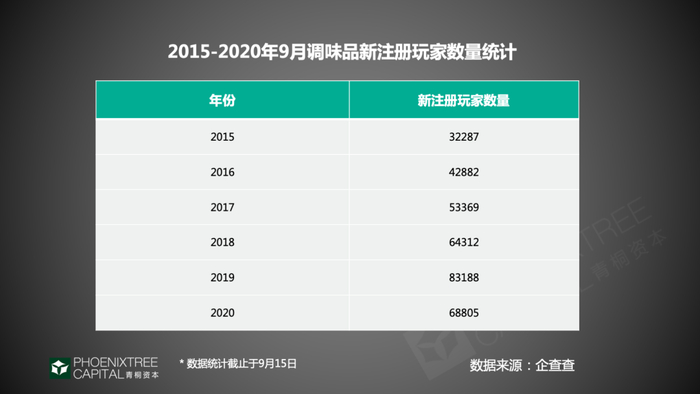 同时,赛道新玩家数量逐年上涨,据企查查数据,2020年1-9月,调味品新注册企业共68805家,2019年为83188家,已是2015年的2.5倍。