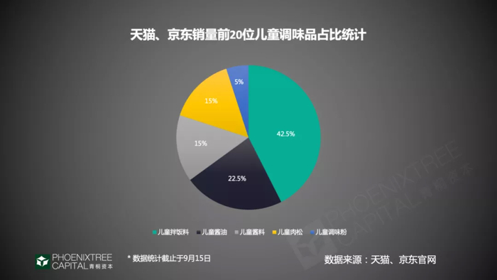 从品类来看,国产调味品居多,儿童拌饭料、儿童酱油最受欢迎。据智研咨询数据,国产儿童调味品占近70%。青桐资本统计天猫、京东数据发现,两大平台销量前20位的儿童调味品中,儿童拌饭料占42.5%,儿童酱油占22.5%。