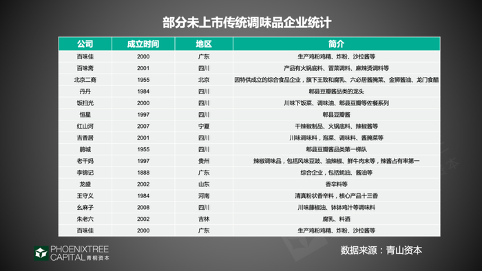 未上市传统调味品企业主要呈现两大特点,品类上,川贵地区的辣椒调味品居多;体量上普遍大,已成为细分品类的头部