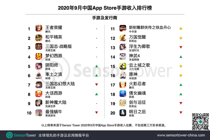 Sensor Tower发布9月中国手游发行商收入排名 腾讯(00700)两款游戏继续领跑