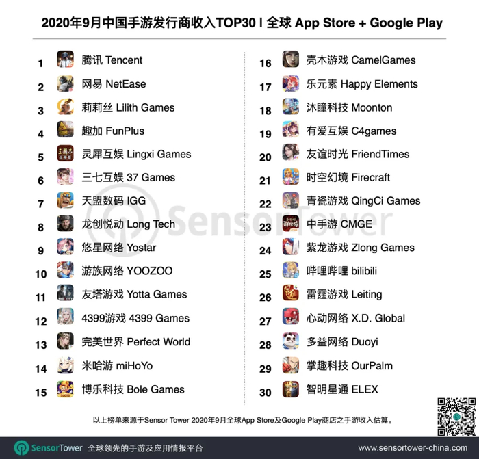 Sensor Tower商店情报平台显示,2020年9月中国手游发行商在全球 App Store 和 Google Play 的收入排名。榜单中30家厂商9月全球吸金19.2亿美元,占当期全球手游总收入28.8%。