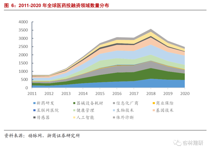 从投资领域来看,生物技术、新药研发及IVD领域逐渐成为投融资主要关注领域。从动脉网数据来看,2020年生物技术领域成为投融资最热点领域,占总体投融资数量的22.58%,其次为新药研发和IVD,分别占据19.56%和15.85%。2020年最大的投融资事件为2020年7月11日百济神州定增20.8亿美元,创生物科技领域最大股权融资纪录。其次为RNA干扰创新药物研发商Alnylam Pharmaceuticals与黑石达成20亿美元战略合作。我们看到,全球医疗健康一级市场的投资金额并未因卫生事件巨大冲击而受到削减。短期内生物技术、新药研发及IVD仍是投资的绝对热点领域;远程医疗、检测、等相关领域的融资需求反而得到了更快响应,长期来看未来一级市场对医疗健康领域有望得到持续关注和倾斜。