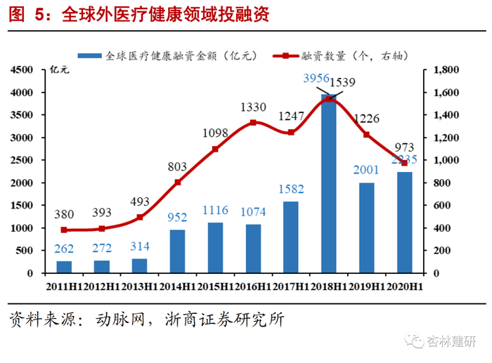 2020H1海内外市场融资热点分化,国内市场对器械及IVD领域关注度更高。观察2020H1投融资细分领域分布情况,海内外市场对生物医药投融资热度仍保持最高,但其他领域则侧重不同,海外市场对数字医疗领域投资更为关注位列第二;国内市场,自卫生事件爆发后,医药器械与耗材体外诊断领域则收到市场青睐。我们认为,随着中国卫生事件率先在全球范围内得到缓解,国内市场正成为全球医药市场投资的优质标的,下半年国内医药健康领域投融资情环境有望继续好转。