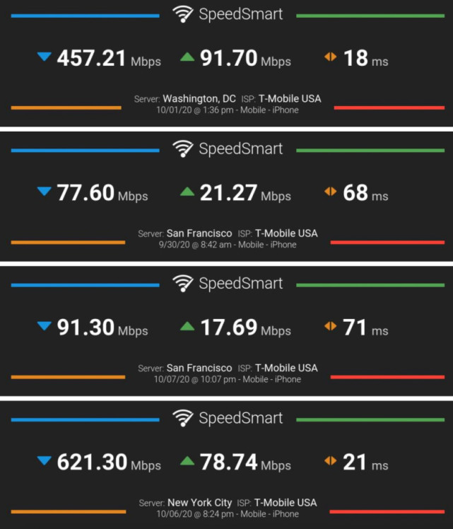 此外, 调研机构SpeedSmart也公布了一些新iPhone 12的早期5G速度测试结果,考虑到iPhone 12还没有正式上市,测试结果数量有限。