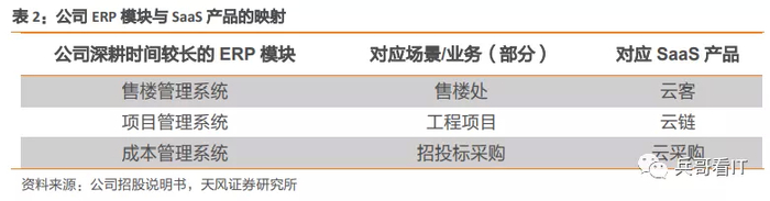 3)2012年至今:公司意识到传统软件商业模式的瓶颈,2014年开始推出SaaS产品向互联网转型,并于2017年推出云ERP解决方案。伴随着对行业供需主要矛盾的持续解决,公司逐步确立了房地产开发行业软件解决方案提供商的头部地位,并形成了产品、渠道、咨询三大核心竞争力。