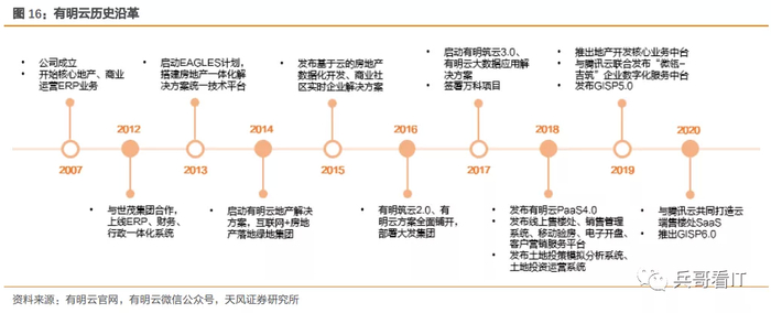有明云成立于2007年,起家于核心地产、商业运营ERP产品,也为SAP进行ERP实施服务;2014年开始启动互联网+房地产解决方案,并以绿地集团为天使客户。2017年末公司有171名员工,遍布北京、上海、深圳、昆明及美国,在万科、华润等大型地产公司有项目落地。公司产品类型较为丰富,可形成较为完整的业务闭环。公司不仅布局投资、计划运营、成本、销售等ERP模块,案场SaaS应用产品,还推出自主研发的企业中台有明云服务平台(GiSP)。