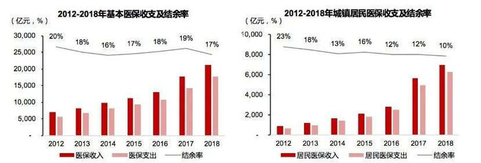2018年,我国基本医保结余率由2012年的20%下降至17%,城镇居民医保结余率下降更为显著,由23%降至10%。此外,根据中国医保局等数据显示,2018年我国社会医保占比总医疗支出56%,人群基本覆盖,但缴费无法覆盖支出,亟待再控费改革。