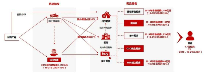 为了改变医药流通产业链从各个批发商至零售商再到患者终端的繁冗,两票制简化了流通环节,由药厂至终端客户仅需两级甚至一级。流通环节中,院边药房、B2B电商、O2O及B2C电商增速较快,由此判断这几类业态将成为未来医药流通领域重要的驱动点。