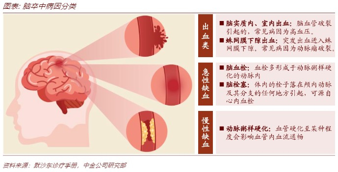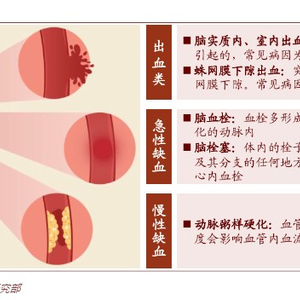 脑卒中病因为脑血管阻塞或破裂出血。脑卒中,俗称“中风”,是由于脑部血管阻塞或破裂导致血液无法顺利流入大脑引起脑组织损伤而引发的疾病。根据病因不同,前者称为缺血性脑卒中,后者称为出血性脑卒中。