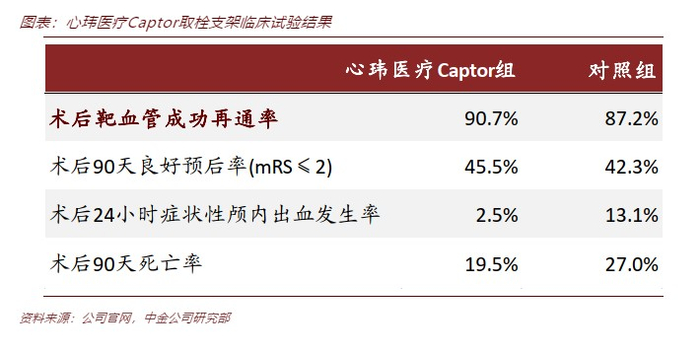 取栓支架评价核心标准为血管再通率和再通时间,国产产品表现优异。评价取栓支架优劣标准包括:(1)血管再通率:支架捕获率(即血栓夹持性)高,取栓回收过程中固定牢固,血栓脱落风险低;(2)再通时间:救治脑卒中需争分夺秒,更短的再通时间将提高疗效。(3)安全性:对血管壁和周围血管损伤小。2020年获批的心玮医疗Captor取栓支架和通桥医疗蛟龙取栓支架,临床实验结果各方面均表现优异,显示出国产产品较强实力。