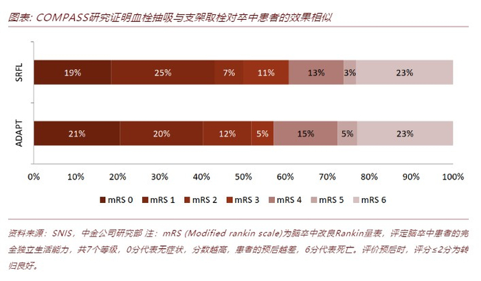 相较于取栓支架,直接抽吸取栓手术时间短,且可避免次级血栓脱落。直接抽吸首次通过技术(ADAPT,a direct aspiration first-pass technique),单独使用以及辅助支架取栓(SRFL,stent retriever first line)使用,再通率和神经功能恢复程度均与仅使用支架取栓相近,并且开通时间短,操作简单,可节约经济成本,有一定优势。