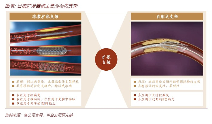血管狭窄引起的慢性缺血性脑卒中:目前多以药物治疗,介入扩张类器械主要产品为动脉支架。SAMMPRIS研究对比药物与支架治疗颅内动脉狭窄效果,并于2011年公布阴性结果,认为药物治疗优于支架,此后治疗指南一直以药物为优。但此研究在试验设计、技术操作和结果解析等方面均存在瑕疵,后续研究有希望改变扭转结果,拉动扩张类器械发展。