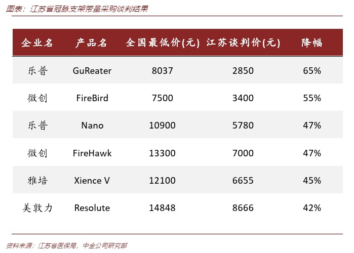 国产价格优势明显,带量采购将起放大作用。国产品牌价格较低,优势明显,我们认为医保覆盖范围扩大和带量采购将放大这一优势。各市神经介入手术医保报销比例在50%以上。江苏省今年已开展冠脉支架带量采购,从结果来看进口品牌在降价幅度和最终谈判价上均处劣势,市场份额较容易在带量集采中下滑。在目前进口品牌占绝对主导的神经介入市场,本土企业迎来发展契机。