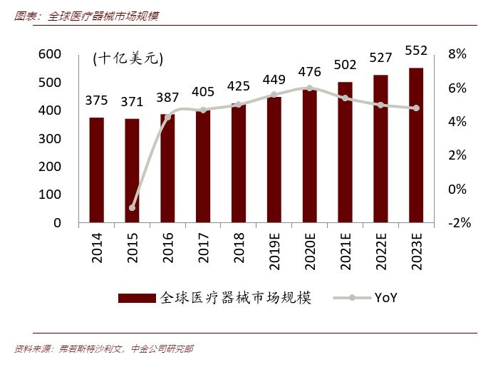 全球神经介入器械市场规模超增速。2014至2018年,全球医疗设备器械市场规模从3,752亿美元增长至4,253亿美元,复合增速为3.2%,弗若斯特沙利文预测2018至2023年增速将达5.4%。2018年,全球神经介入器械市场规模达22.6亿美元,Fortune Business Insights预期2018-2026年将维持8.3%复合增速,超过医疗设备器械平均增速。
