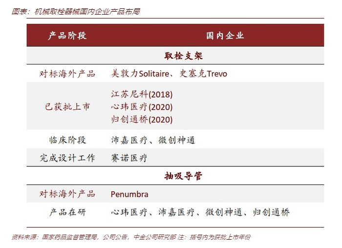 取栓支架:江苏尼科布局最早,2018年已有产品上市。今年8月和9月,心玮医疗和通桥医疗(后与归创医疗合并)产品获批,根据各公司官网和公告,我们预期未来2年内至少有3家公司获批新产品。