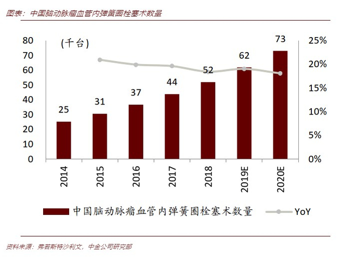 目前国内治疗以弹簧圈为主,我们预计渗透率持续提升。随着患者预防和治疗意识加强及经济负担能力提升,我们预期国内弹簧圈栓塞术渗透率将提高。2018年弹簧圈栓塞术渗透率为5.15%,弹簧圈栓塞手术5.2万台,2014-2018年复合增速为19.7%。