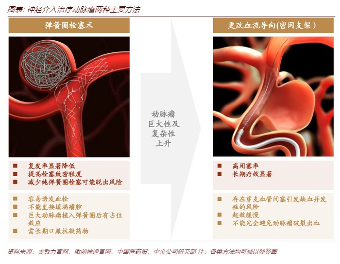 动脉瘤治疗方法:1)弹簧圈+辅助支架栓塞,2)密网支架更改血流导向。一般根据瘤体大小和瘤体与瘤颈比判断治疗产品,窄颈动脉瘤首选弹簧圈栓塞术,宽颈动脉瘤根据瘤体形状选择辅助弹簧圈支架、密网支架等。各类方法可以结合使用。辅助支架可帮助提高栓塞致密程度,减少纯弹簧圈栓塞可能的脱出风险。目前新发展方向为瘤腔内扰流装置(WEB)。