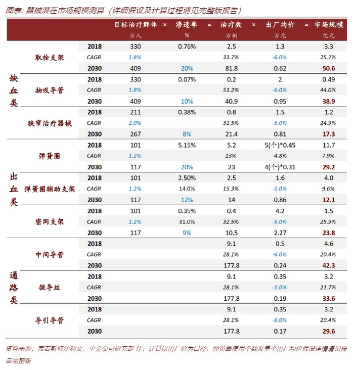 我们以2018年市场容量相关参数为核心假设基数,测算各细分核心器械2030年可渗透市场空间规模,加总后得出整体可渗透空间为277.5亿元。