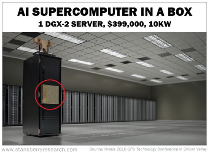 它的DGX-2服务器是“小盒子里的AI超级计算机”。它带有16个Nvidia Tesla V100 GPU,这相当于15个机架的数据中心空间或300个服务器。并且,它体积要小60倍,功率效率高24倍。DGX-2服务器的成本仅为399,000美元,能耗更低。这是标准超级计算机的成本的1/8,空间的1/60和功耗的1/18。