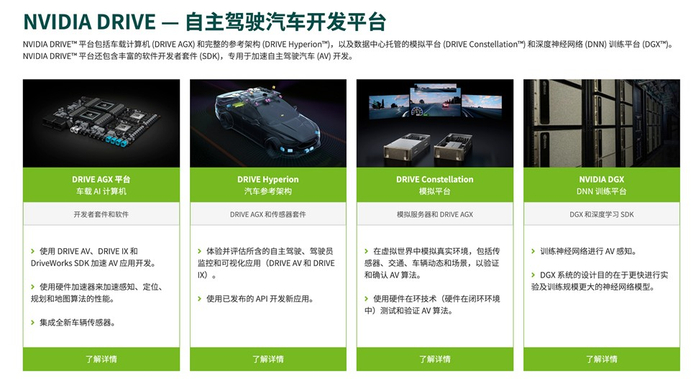 英伟达的自动驾驶业务具体包括驾驶舱信息娱乐、AV平台和相关的开发协议。基于其旗下的开发和应用生态,英伟达研发部署用于自动驾驶汽车的人工智能系统。