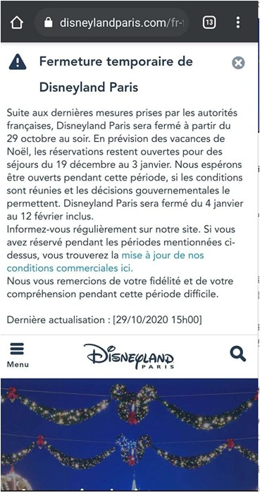 巴黎迪士尼乐园重启后于10月29日晚间再次关闭。巴黎迪士尼希望在卫生事件稳定后,可以在圣诞新年再次短暂重启,即从12月19日到1月3日重新开放以庆祝假期,然后从1月4日到2月12日再次关闭。