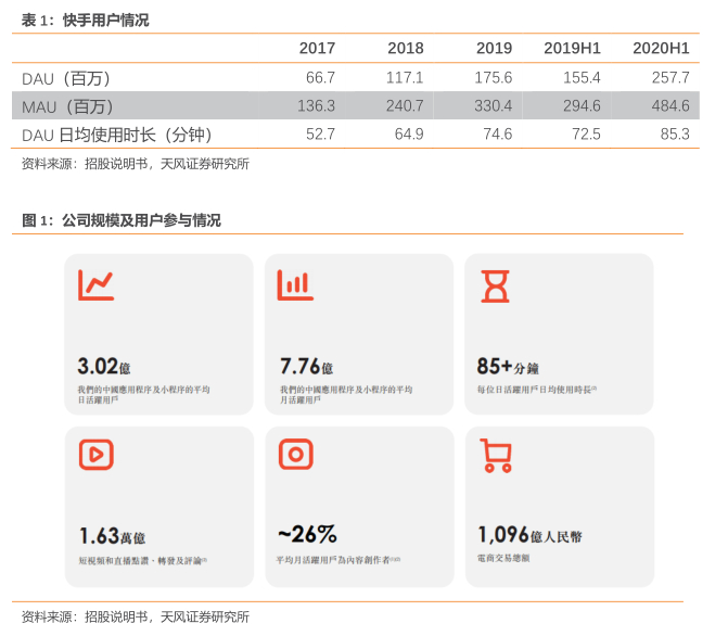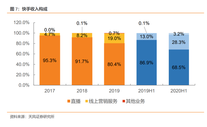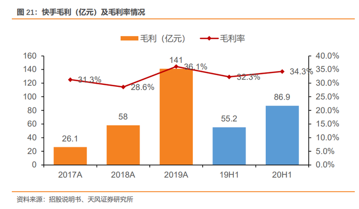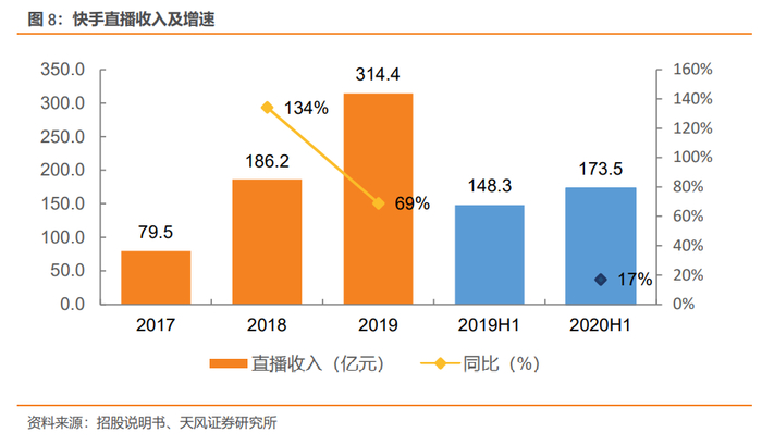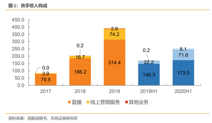 2018年8月公司推出电商业务,电商业务增长迅速,20H1商品交易总额达到人民币1,096亿元,平均重复购买率达60%以上。用户通过在直播、短视频或用户数据页面中提供的链接,在快手或通过第三方电商平台购买产品。快手按所售产品价格及类型收取佣金。作为直播内容的自然延伸,直播电商内容是电商业务增长的主要动力。直播电商内容包括大量商家及推广人员与用户互动以实时营销各种产品。主播及短视频创作者(包括品牌及零售商)使用直播、短视频及平台上的数据页面向观众营销及推广产品。截至2020年6月30 日止六个月,平均重复购买率达60%以上。