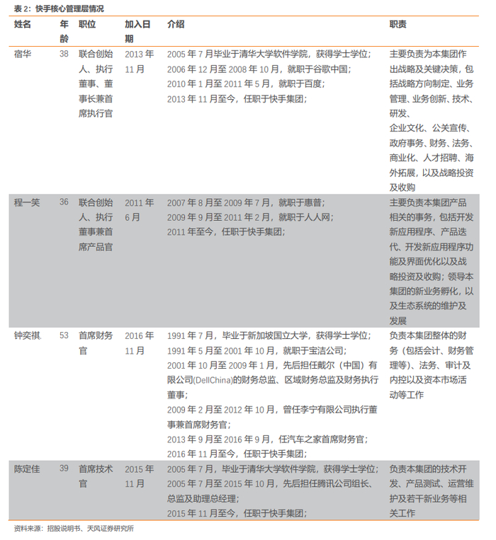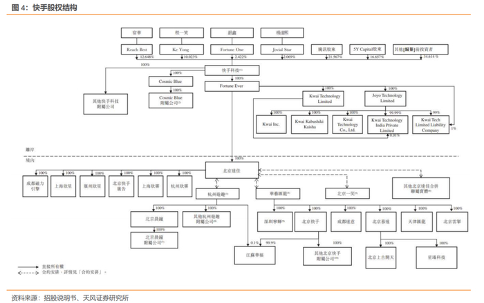 截止招股书签署日,宿华和程一笑分别持有快手科技12.65%、10.02%的股权,两人分别持有A类股权和B类股权,其中A类股权每一股代表10票投票权,B类股权每一股代表1票投票权,同股不同权。除此之外,腾讯持有21.567%的股权,5Ycapital持有16.657%的股权。