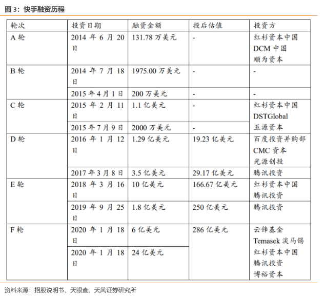 快手集团作为优秀的独角兽公司,在资本市场上频频受到投资者的青睐,快手集团历史上曾有过六次重大融资,最新一轮融资为2020年1月,共计融资30亿美元,投后估值286亿美元。
