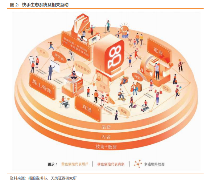 下图展示了快手生态系统及相关互动。用户可在快手平台上接触到丰富的内容, 通过短视频或直播进行创作,出售和购买产品等等。商家可以在快手平台上宣传及销售自己的产品与服务。丰富的互动形式加深了用户和商家对平台的依赖。
