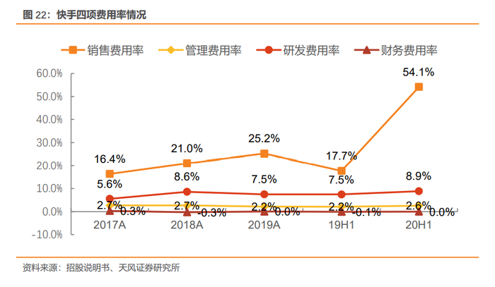 1) 销售费用方面,公司市场推广投入加大。销售费用由19H1的30亿元增加至20H1达137亿元,销售费用率达54%。主要是由于推广快手极速版与其他应用程序的营销开支以及品牌营销活动开支增加。