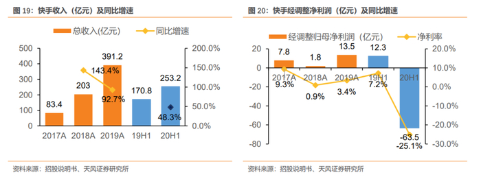 快手科技2019年和2020年H1分别实现收入391.2亿元和253.2亿元,分别同比增长92.7%和48.2%,实现经调整净利润分别为13.5亿元,-63.5亿元,对应净利率分别为3.4%,-25.1%。净利率大幅下降主要是由于2020上半年进行大规模市场投入、推广快手极速版等应用,销售费用大幅增长所致。