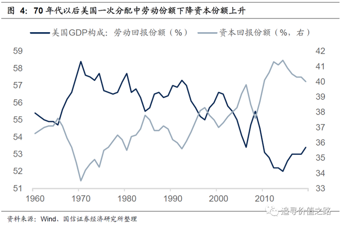 相较于经济总量增速变缓,美国经济中存在的更大问题是收入分配的问题,这个问题在过去十年中各种媒介场合都被广泛讨论。一方面,可以看到,大体上从70年代开始,美国经济的一次分配中劳动回报的份额(labor share)在不断降低,劳动者回报占GDP的比重过去五十年里大概下降了五个百分点,与此同时,对应的是资本回报的份额在不断上升。