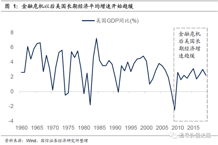 2008年金融危机以后,在美联储量化宽松和全球的刺激政策下,美国经济从2010年起走出了经济衰退,从2010年到2019年这十年间美国的实际GDP平均增速在2.3%。相比金融危机以后其他发达国家的经济增速,美国的这个成绩应该说不算差,但是相比其自身过去几十年的经济发展,可以很明显地看到,过去十年间,美国出现了显著的长期经济增速趋缓的现象。