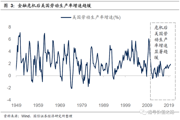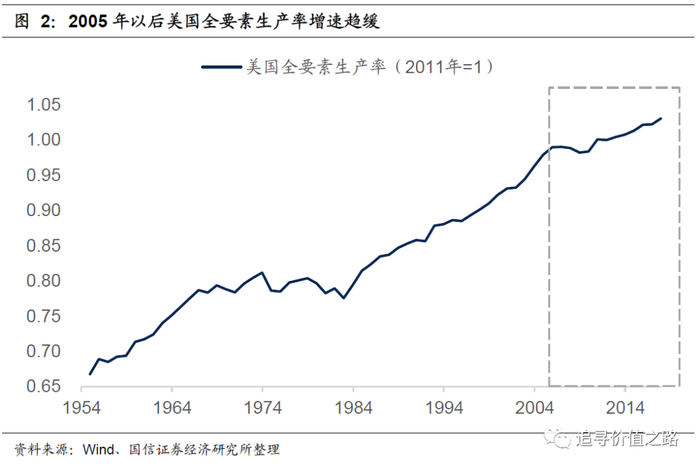 根据Penn World Table(佩恩表)计算的不变价全要素生产率,美国的全要素生产率在1985年到2005年快速上升,2005年之后全要素生产率依然在增长,但是增速明显趋缓。美国劳工部(BLS)统计的劳动生产率情况也是相同的趋势,金融危机以后美国劳动生产率的平均增速相较于过去,出现了明显下降。我们知道,在经济学理论上,劳动者的工资取决于劳动的边际生产率,劳动生产率增速的趋缓决定了工资增速也会变慢。