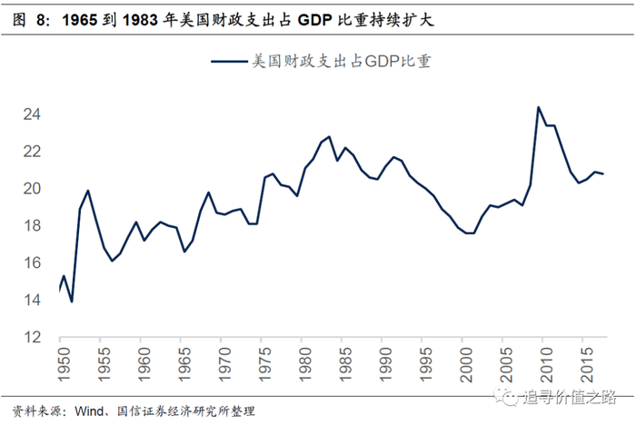 随后我们看到,1964年林登·约翰逊接替肯尼迪继任为美国总统后,提出了“伟大社会”(Great Societies)的施政目标,实现这一目标,美国国会通过了包括“向贫困宣战”、“保障民权”及医疗卫生等方面的立法四百多项,将战后美国的社会改革推到了新的高峰。这个过程中,“伟大社会”的施政纲领,把大规模赤字财政作为经常性政策,从1965年开始,美国政府财政支出占GDP的比重不断上升,这个趋势一直持续到80年代的里根政府时期。