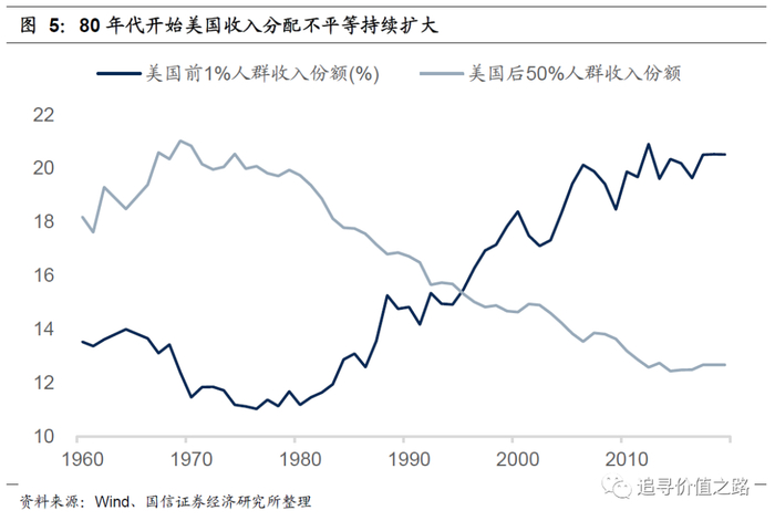 收入分配问题更直观的表现,是不同人群的收入份额的巨大分化走势。从80年代开始至今,美国收入前1%的人群的收入份额一路攀升,从11%上升到了现在的20.5%左右,而作为大多数人的后50%人群的收入份额则从20%下降到了目前的12.6%左右。图5中不同人群收入份额的“X”型走势,深刻反映了过去几十年了美国经济发展过程中积累下来的问题和矛盾。