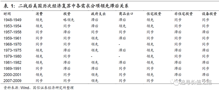此外,有一个非常值得重视的地方,从经济增长的驱动因素来看,海外经济复苏的动力和国内不太相同,国内经济复苏更多的是依靠基建和地产,特别是基建的影响很大,这决定了对资源品的利好更多。而海外经济复苏更多是依靠消费和地产,我们总结了二战后至今美国一共11次经济复苏中各需求分项的领先滞后关系,可以看到,每次的经济复苏多数情况下是靠消费和地产拉动的,这种模式决定了对工业品的利好更多。