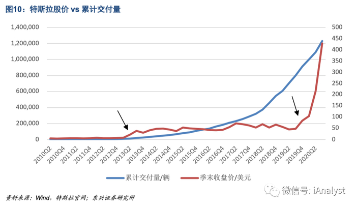 从特斯拉二级市场复盘来看,其市值出现跃升现象的阶段,大多伴随交付进度方面的边际改善。比如, 2013Q2特斯拉首款量产轿车Model S累计交付量破万;又如,2018年弗里蒙特工厂走出“产能炼狱”和2020年上海工厂产能迅速爬坡带来的交付量增长,2020Q1特斯拉累计交付量突破100万辆。