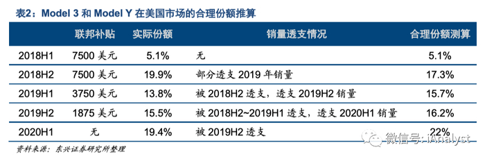 美国市场补贴退坡后,特斯拉市占率仍稳步提升。根据美国联邦新能源补贴政策,由于特斯拉累计销量达到20万辆,其新能源补贴自2018年开始退坡,并且从2020年起不再享受补贴。凭借对核心技术的掌握和独特的品牌定位,特斯拉对美国联邦补贴的依赖度逐渐减弱。2020H1特斯拉Model 3和Model Y在美国B级豪车(轿车+SUV)市场的份额达到19.4%。考虑到补贴退坡前夕存在透支销量的情况,我们判断二者车型的合理市占率为22%。