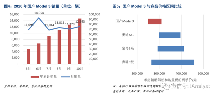 我们在研究报告《特斯拉逐步摆脱补贴拐杖,产能瓶颈或持续至21年底》(20200728)中提到,2020H1国产Model 3在B级豪车市场的市占率仅9%,主要是受到产能抑制。目前特斯拉上海工厂产能迅速提升,2020Q3财报显示其年产能达到25万辆(对应周产能4800辆),我们判断供给端或不再成为国产Model 3销量提升的主要瓶颈。