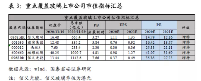 2) 旗滨集团:将公司2021年业绩分为悲观、中性、乐观三种情况,最悲观预测下公司2021年归母净利仍达33.5亿,中性、乐观预测则分别达39.3、46.6亿元,三种情境业绩增速分别达60%、88%、123%,而对应当前PE分别为10.8X/9.2X/7.7X。
