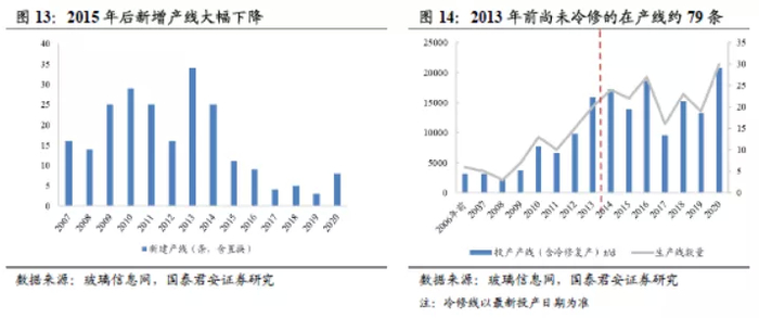 另一方面,2007-2013年为浮法玻璃产能投放高峰期,我们统计当前有效产线中,期间第一次点火产线共计129条,对应总产能8.8万吨/天,约占浮法有效产能的50%(2013年前点火当前尚未冷修线79条,对应产能5.2万吨/天,约占当前在产产能的32%)。浮法玻璃产线窑龄约8年,理论上2015年始浮法玻璃进入平稳的冷修高峰期,但企业冷修并非“形而上学”的静态逻辑,企业亦考虑当期市场行情(若行情较好企业冷修延迟)。因此,实际上2007-2013年高窑龄线成为2015年后行业供给的第一批“调控阀”,这也解释了2019-20年“V”型反转的深层逻辑——行情底部批量高窑龄产线冷修,供需适配后基本面触底,竣工需求回暖后行情走俏。