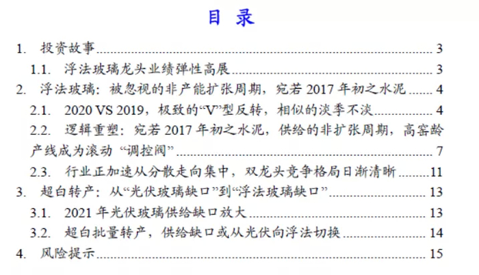 我们认为浮法工业已然进入非产能扩张周期,宛若2017年初之水泥,高窑龄产线成为滚动调控阀,而2021年超白浮法转产光伏组件背板将驱使浮法龙头业绩弹性高展。