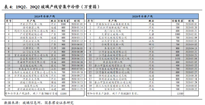 另一方面,环保趋严或公司经营不善驱使行业落后产能持续出清。2016年前河北沙河地区曾为国内浮法产能聚集地,占比超20%。但自2017年始,沙河不环保产能呈现逐年缩减态势,2017年11月集中关停9条线,2018年8-9月再停4条线,而2019年9-10月与2020年4-5月分别关停2条、5条线,2020年9月底沙河在产产能较2016年底压缩过半。