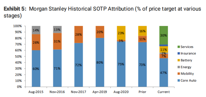 此次,摩根士丹利采用SOTP估值法,将特斯拉同时经营的不同业务分别选择合适的估值方法估值,再根据持股比例加权汇总得出总价值。其具体估值情况如下图所示: