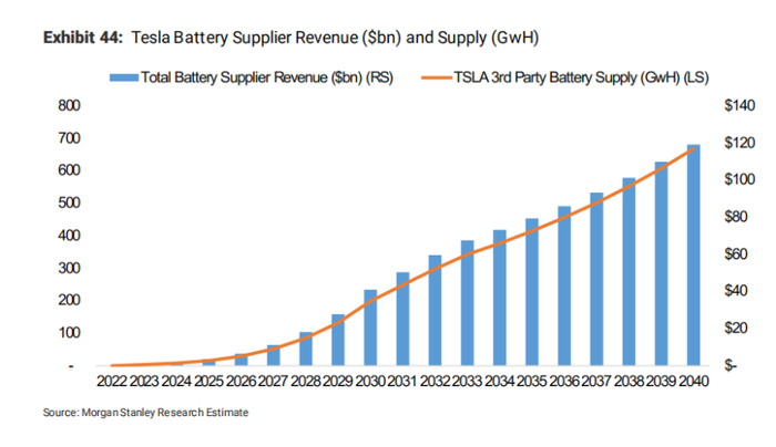 其假设如下:到2030年,除自留的380万之外,其第三方交易量约为250万单位。其供应给第三方的电池可输出200GWh(占市场总量1.7TWh的11.9%)。