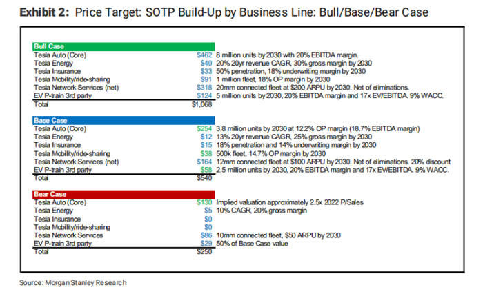 摩根士丹利对于特斯拉的核心汽车DCF业务给予了254美元/股的基础估值,乐观估值462美元/股,悲观估值130美元/股。