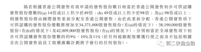 京东健康此次共计发行约3.82亿股新股,国际配售95%,公开发售5%,若公开发售超购14倍或以上少于49倍,公开发售比例将由5%增至9%,超购49倍或以上少于98倍即增至10%,超购98倍或以上则回拨至11%。